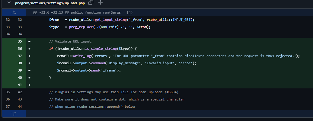 rcmail::write_log('errors', 'The URL parameter "_from" contains disallowed characters and the request is thus rejected.');