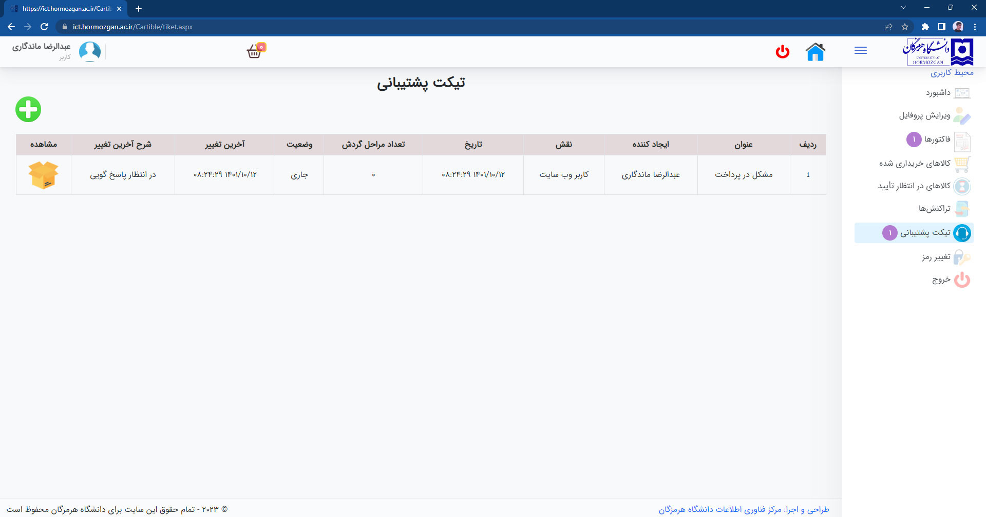 با رفتن به حساب کاربری با استفاده از منو سمت راست گزینه تیکت پشتیبانی