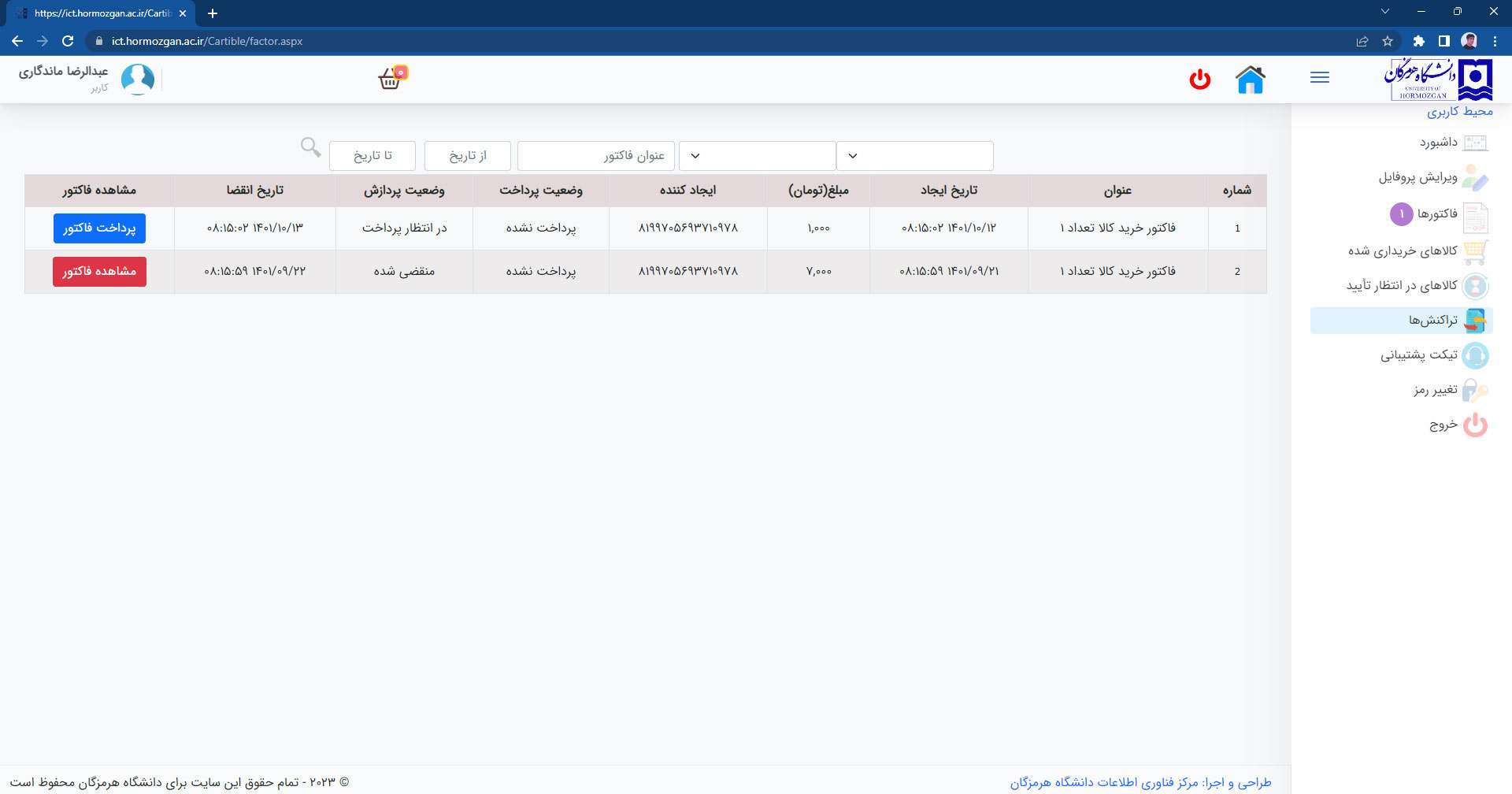 میتوانید فاکتورهای صادر شده را مشاهده نمایید.